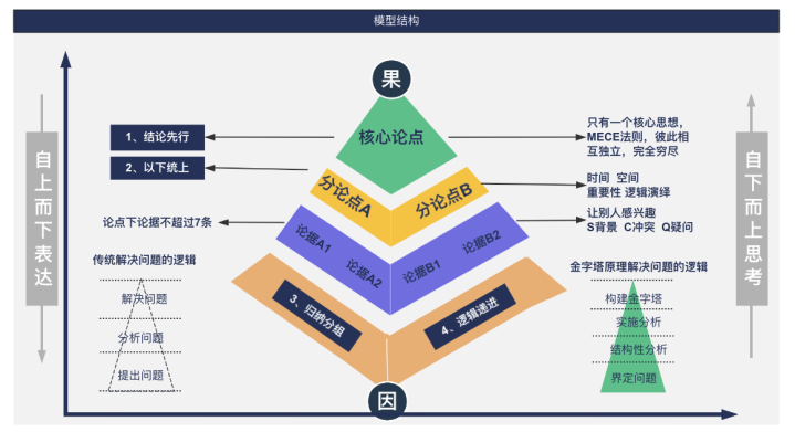 金字塔原理是一种重点突出、逻辑清晰、层次分明、简单易懂的思考方式、沟通方式和规范模式。它的基本结构是:中心思想明确,结论先行,以上统下,归类分组,逻辑递进。善用金字塔原理,就能帮我们把汇报内容构建得稳稳当当,层次分明。